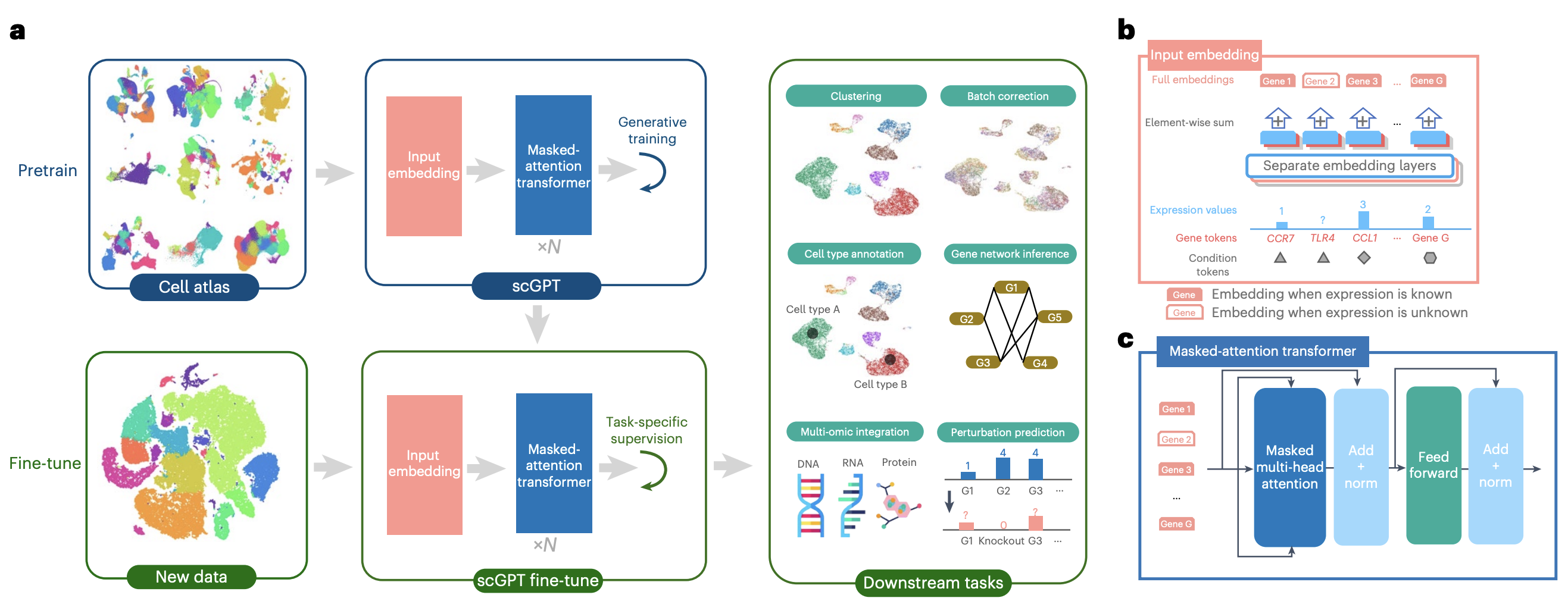 (Source: Cui et al., Nature Methods 2024. The figure shows the input embedding design, the masked-attention transformer, and the pretrain-then-fine-tune workflow across multiple single-cell tasks.)