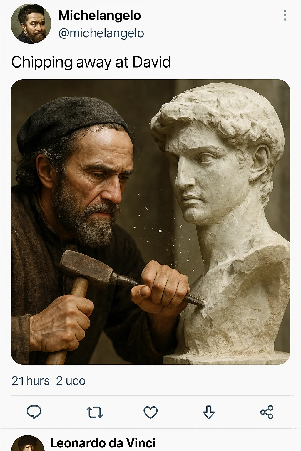 Prompt: "a hyper realistic twitter post by Michelangelo . include a selfie of him chopping the stones on a halfway done David statue."