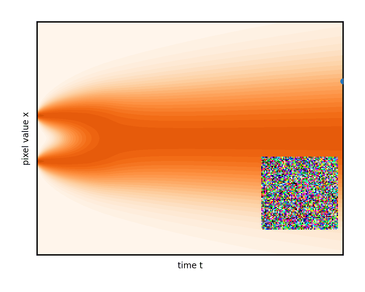 This makes computing \(x_t\) very convenient. Furthermore, \(\bar{\alpha}_T \approx 0\), meaning that after \(T\) steps, only noise remains.