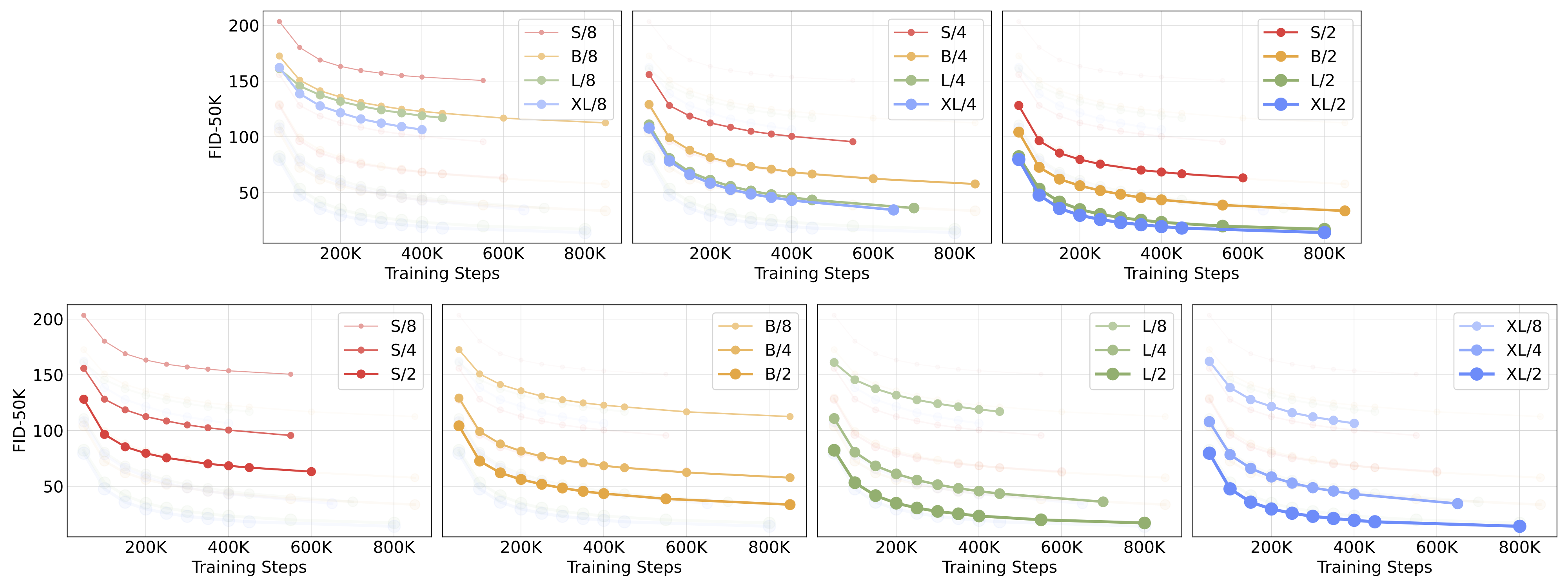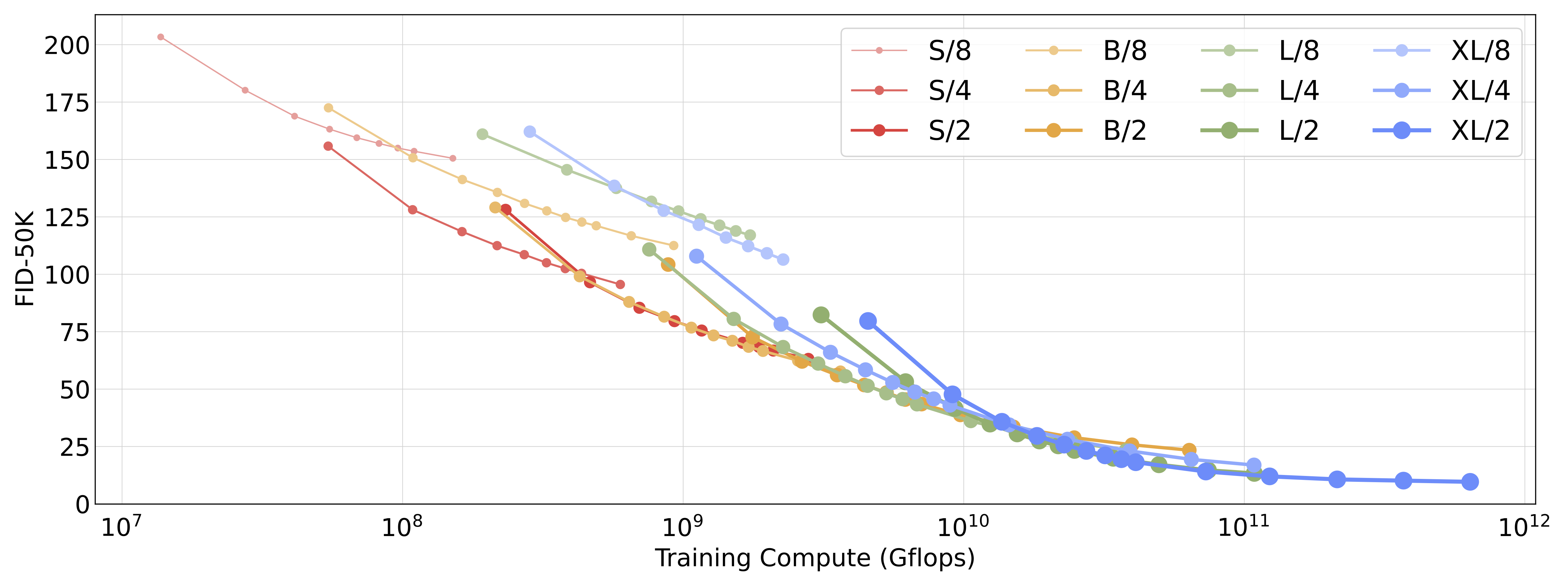 The answer was yes: larger DiT models with more compute achieved better sample quality, measured by lower FID.