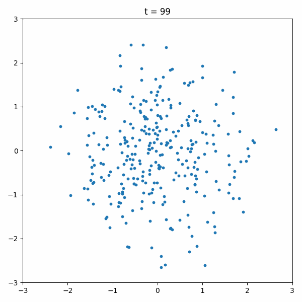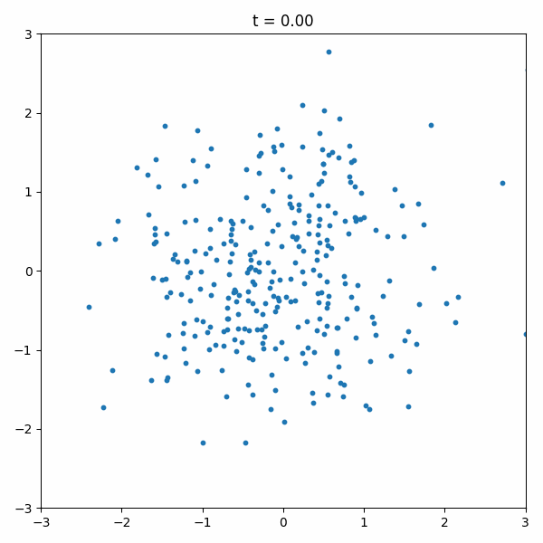 The animation below compares the flow matching and the DDPM on the moons dataset. You can see that the flow matching is more stable and efficient.