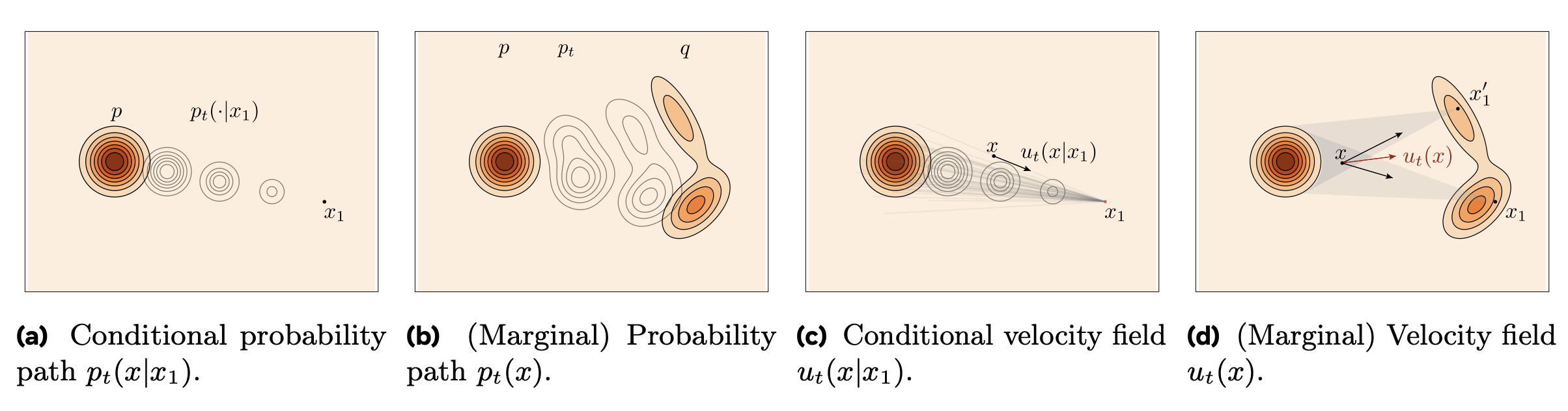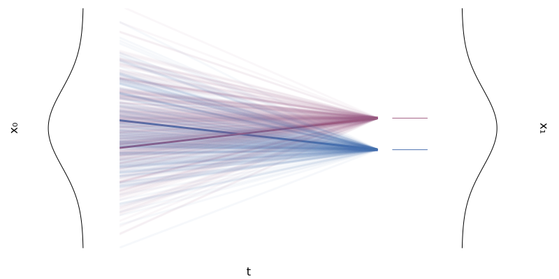 We can then take the above example as a conditional case for the general target density \(X_1 \sim p_1(x)\). Each \(X_{t|1}\) is a conditional path and we mix all paths \(p_t(x|x_1)\) to get the final density \(p_t(x)\).