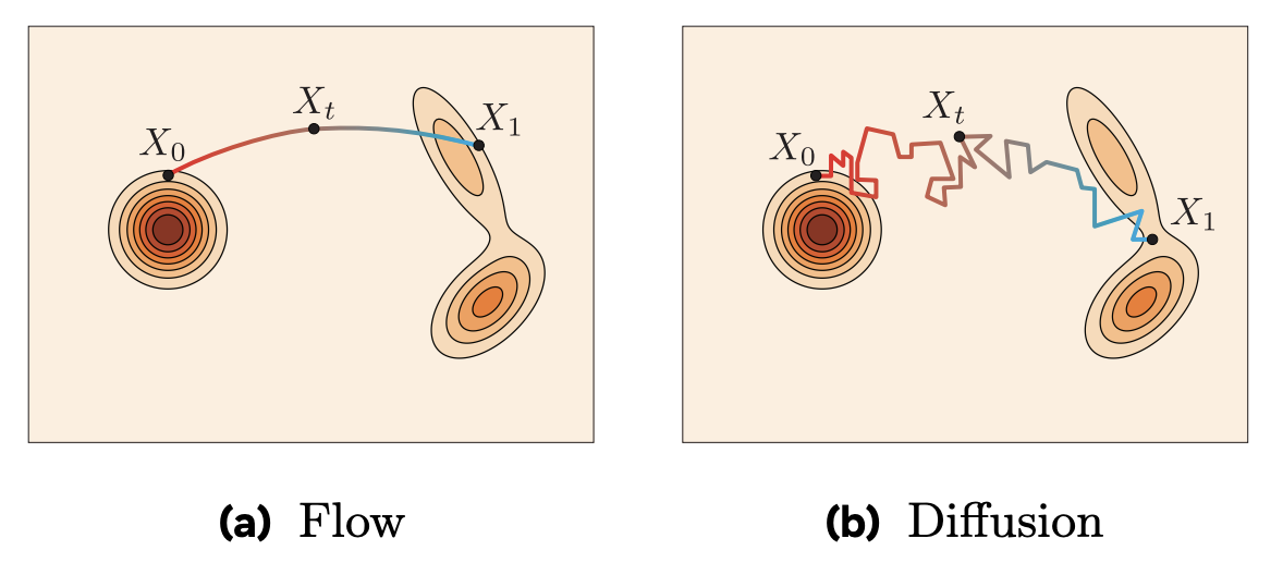 To overcome these two problems, Flow matching's idea is to directly interpolate between the data density \(p_1(x)\) and the Gaussian density (or other simple density) \(p_0(x)\).
