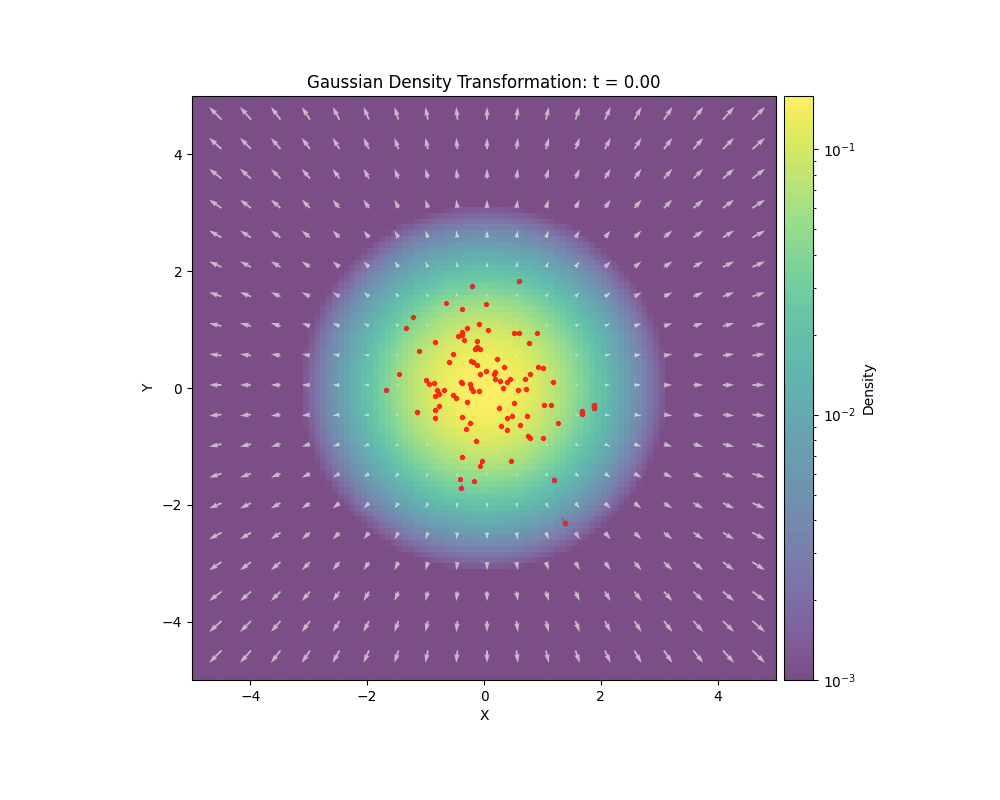So how do we interpolate between \(p_1(x)\) and \(p_0(x)\)? From the previous lecture, we know that a density \(p_t(x)\) can be evolved following a vector field \(u_t(x)\):