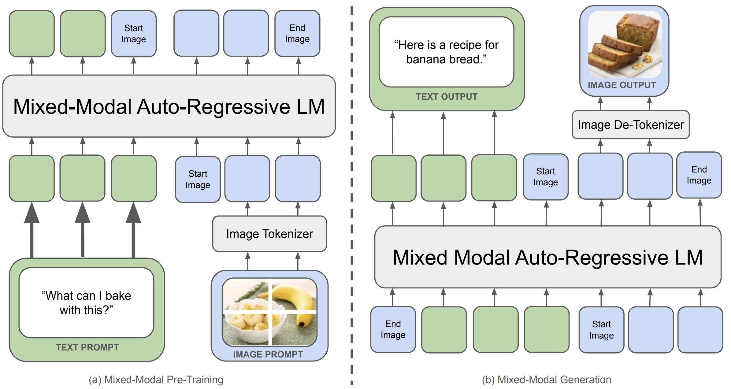 Figure: Early-fusion mixed-modal architecture. On the left, during pre-training, text prompts and images are tokenized into a single interleaved sequence and fed to a unified autoregressive transformer. On the right, at generation time, the same model produces both text tokens and image tokens, which are then decoded back into pixels by an image de-tokenizer. Text tokens are shown in green; image tokens in blue. (Source: Chameleon, Meta FAIR 2024)