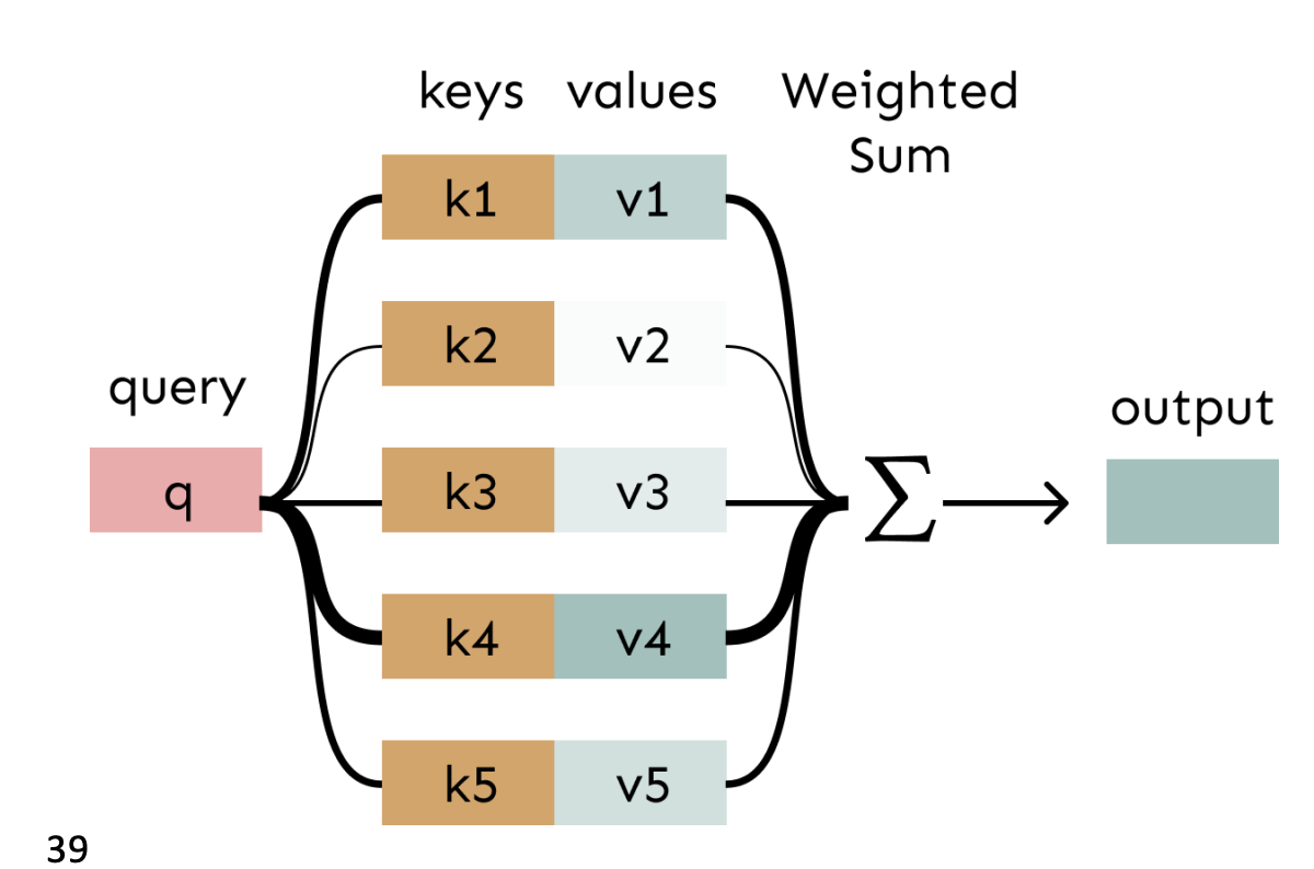 In attention, the query matches all keys softly, to a weight between 0 and 1. The keys’ values are multiplied by the weights and summed.