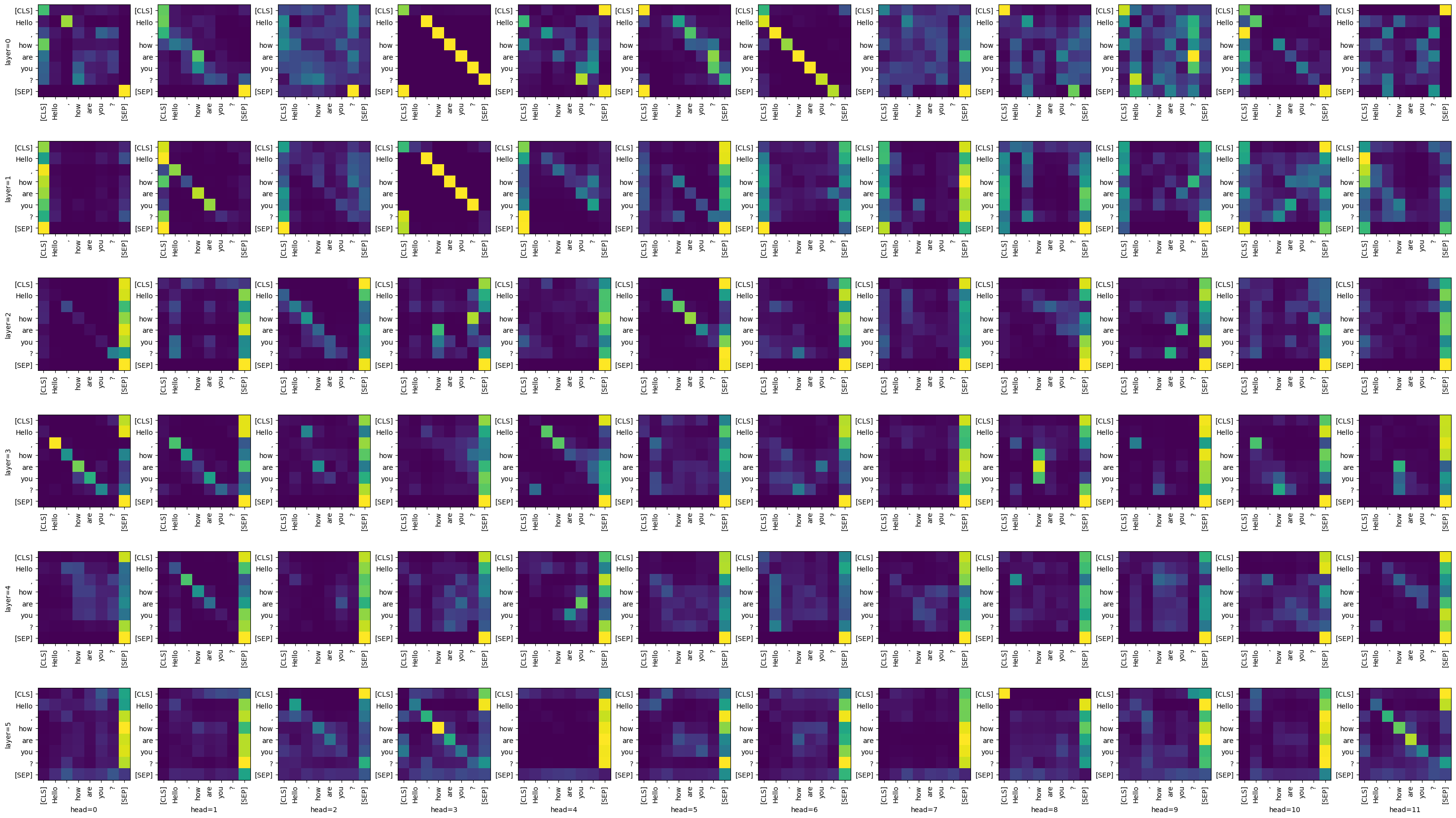 print(f"Attention head size (per layer): {model_output.attentions[0].shape}") # (layer, head_number, query_word_idx, key_word_idxs)