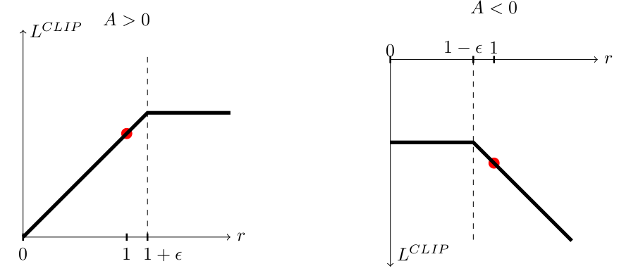 - When \(\hat{A}_i < 0\) (bad completion): the ratio \(\rho\) is clipped at \(1 - \epsilon\), preventing the policy from moving too far away from it in one step