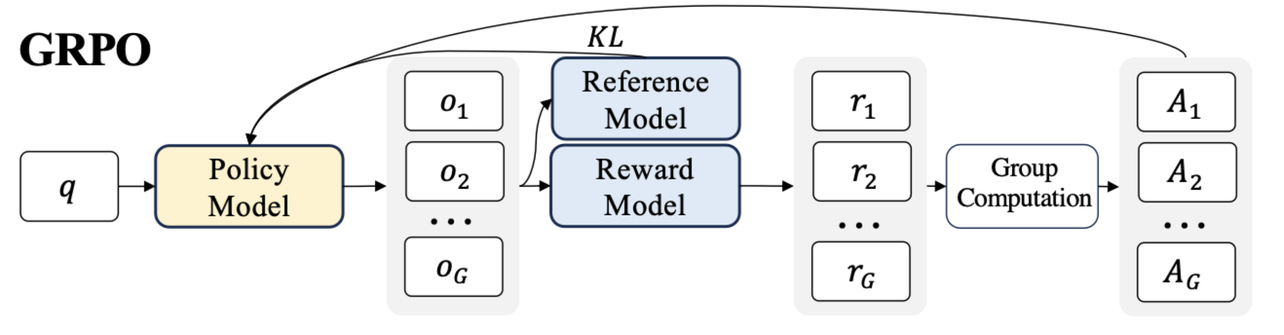 \(\{o_1, o_2, \ldots, o_G\} \sim \pi_{\theta_{\text{old}}}(\cdot \mid q)\) - Score each completion with a reward function: \(r_i = r(o_i, q)\)