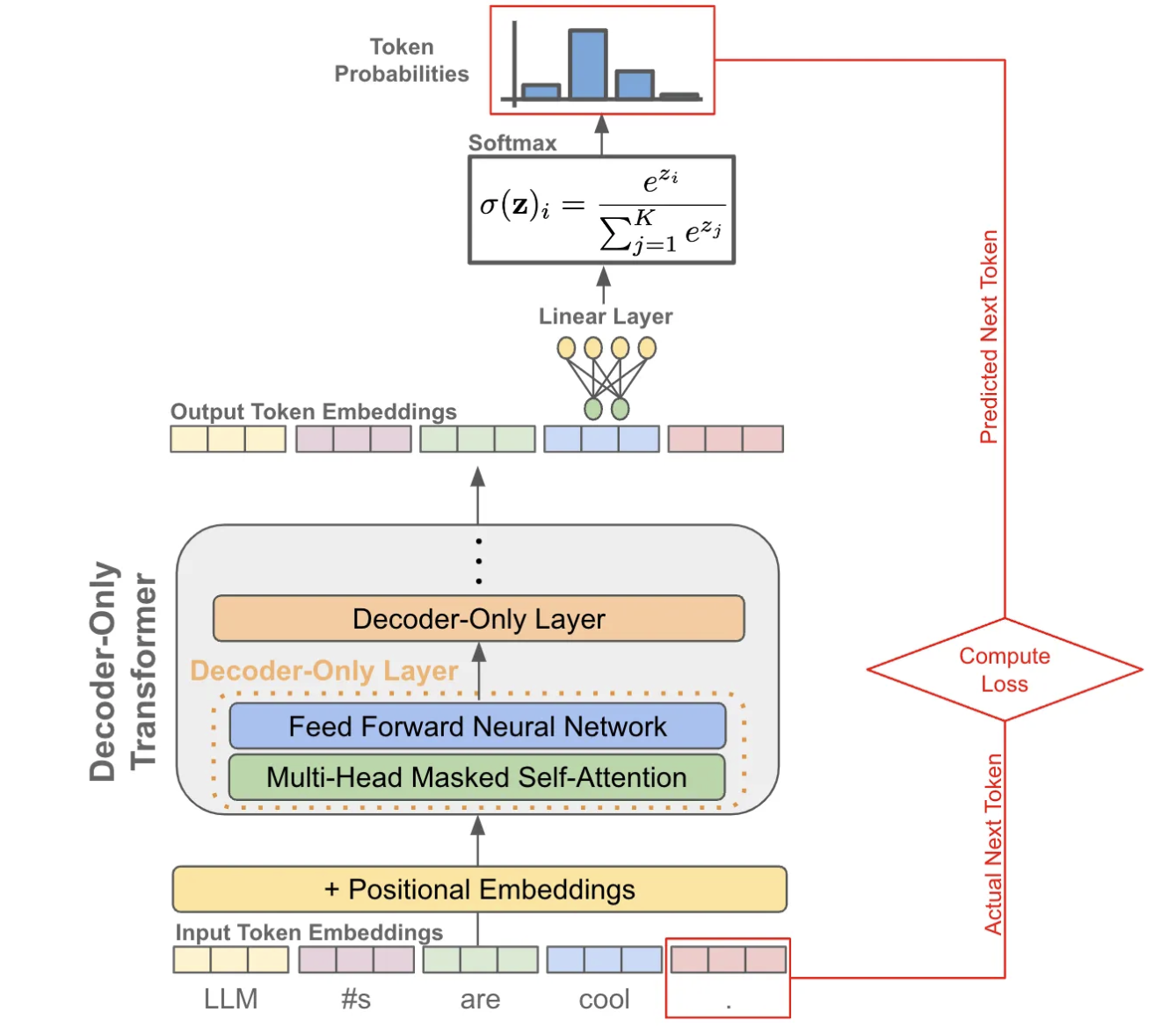Autoregressive generation: At inference time, the model generates token by token—each new token is appended to the context and fed back in to predict the next: