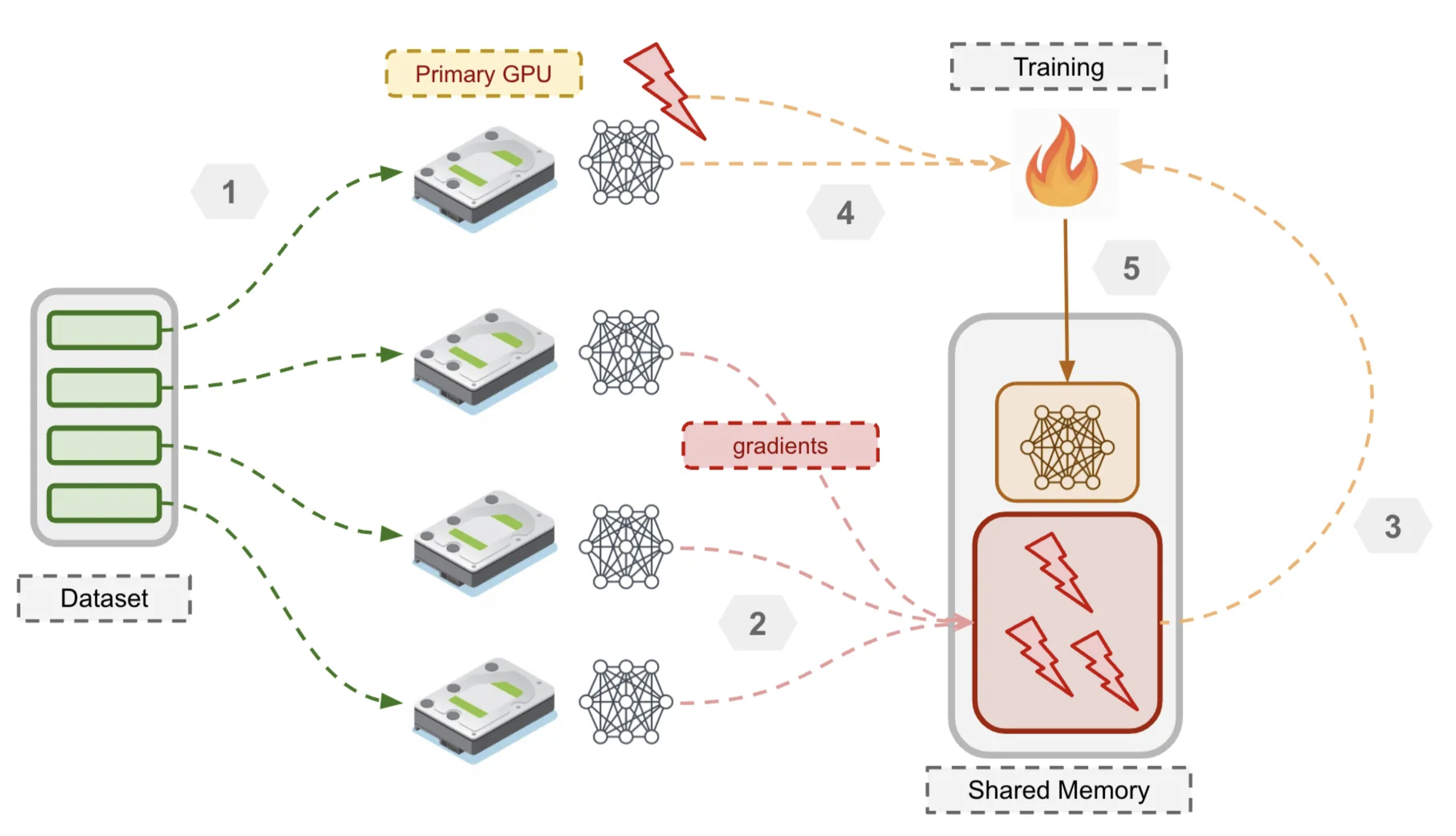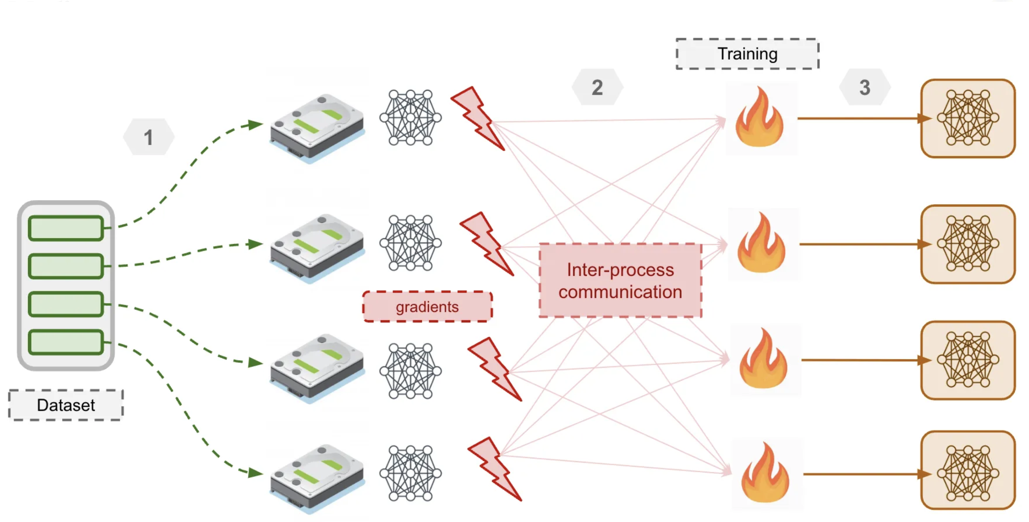 At every loss.backward(), DDP does something magical: All GPUs talk to each other and exchange gradients.