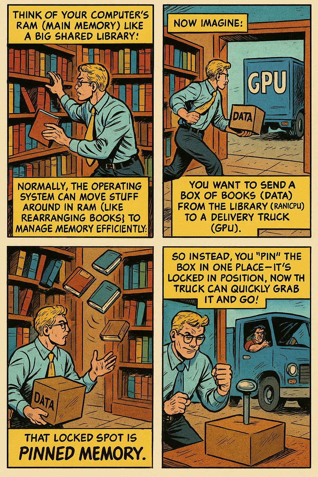 Now imagine: You want to send a box of books (data) from the library (RAM/CPU) to a delivery truck (GPU). If the books are moving around or not fixed in place (pageable), it’s harder to pick them up and load them into the truck. So instead, you “pin” the box in one place — it’s locked in position. Now the truck can quickly grab it and go!
