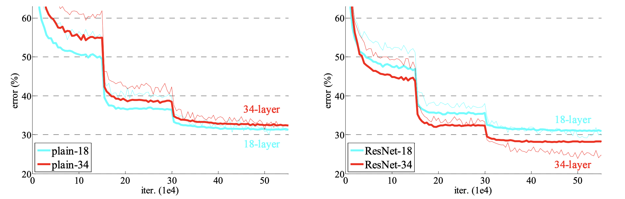 The issue wasn't just vanishing gradients (which can be partially addressed by proper initialization and batch normalization), but rather the difficulty in optimizing very deep networks. Traditional deep networks struggle to learn identity mappings when they would be optimal, leading to degraded performance as depth increases. The following figure shows a training curve (non-bold line) and testing curve (bold line) on the ImageNet dataset with a network of depth 18 and 34. The left plot uses a traditional deep network and you can see that the validation error increases when model becomes deeper.