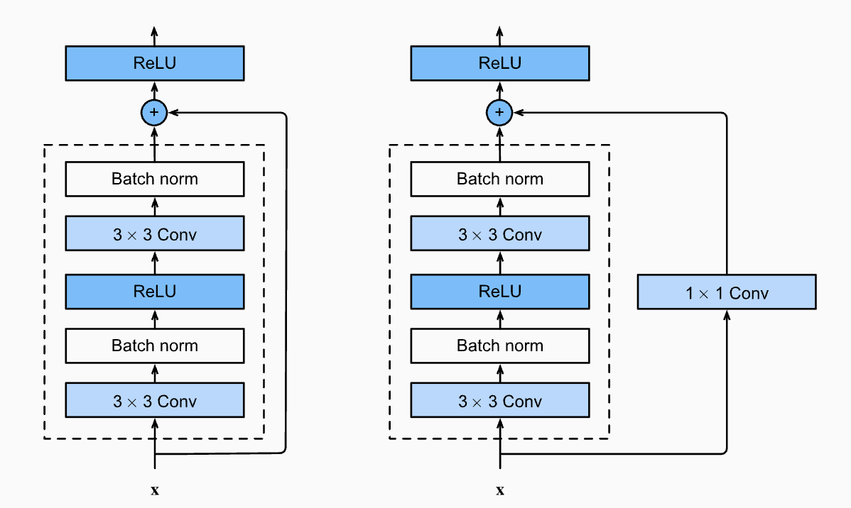 When the dimensions of \(x\) and \(F(x)\) are different, the skip connection is a linear projection of the input to match the dimensions of the output: \(H(x) = F(x) + Wx\). In practice, we use a 1x1 convolution to match the dimensions of the input and output: