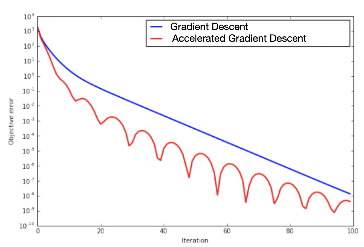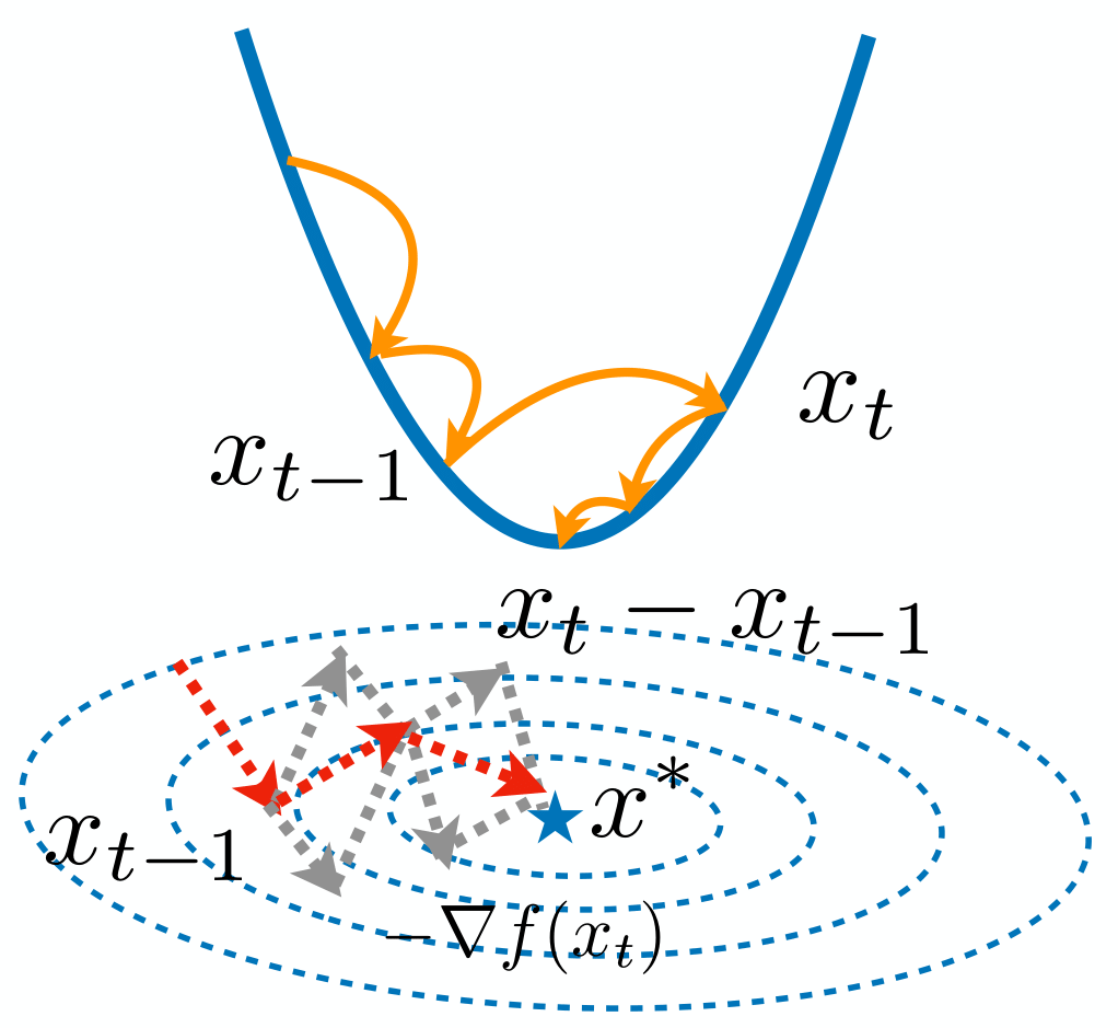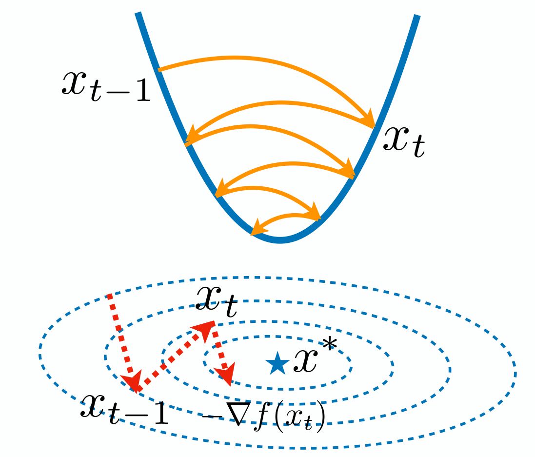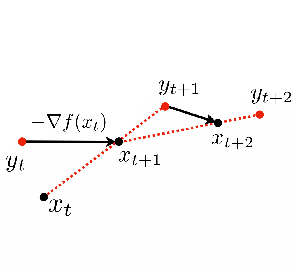 Instead of only using the local gradient at \(x_t\), we can combine \(-\nabla f(x_t)\) with information from previous points, like \(x_t - x_{t-1}\). This creates a more stable direction with less zigzagging. Nesterov proposed the following accelerated gradient descent algorithm: This idea is also called "momentum", borrowed the intuition from the physics.