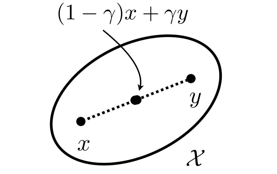 Definition (Convex set and function): A set \(\mathcal{X}\) is convex if