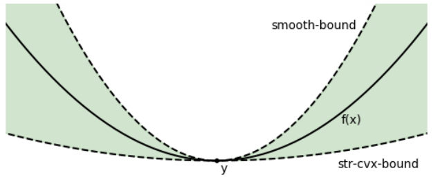 Many optimization problems in data analysis have nice properties. We will formally define the nice properties called "strongly convex" and "smooth" below, but informally speaking, an objective function \(f(x)\) is good enough if it can be upper and lower bounded by a quadratic function: