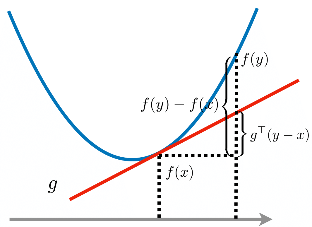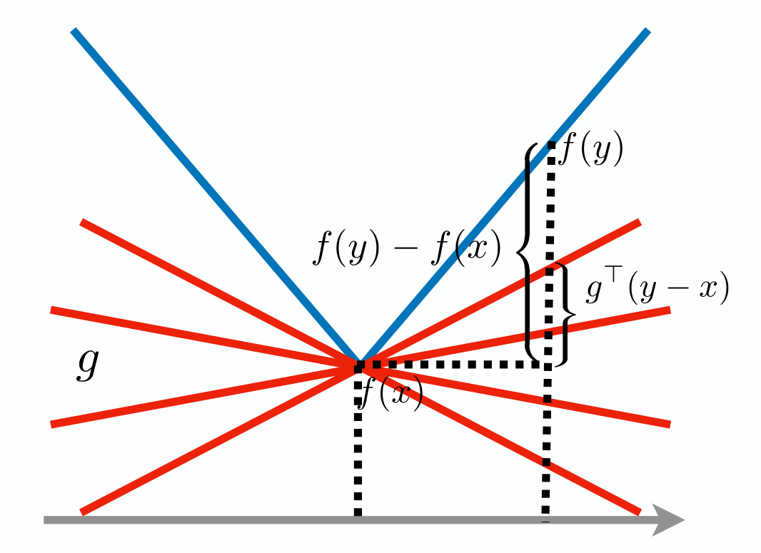 Definition (Subgradient): Let \(f: \mathcal{X} \rightarrow \mathbb{R}\). We say \(g \in \mathbb{R}^d\) is a subgradient of \(f\) at \(x\) if for any \(y \in \mathcal{X}\):