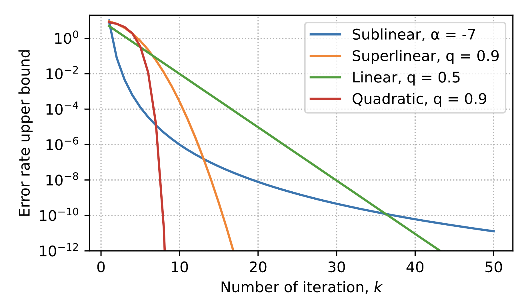 In numerical analysis and optimization, understanding the rate of convergence is crucial for evaluating the efficiency of algorithms. The rate of convergence describes how quickly a sequence approaches its limit. Here, we explore different types of convergence rates: linear, sublinear, superlinear, and quadratic.