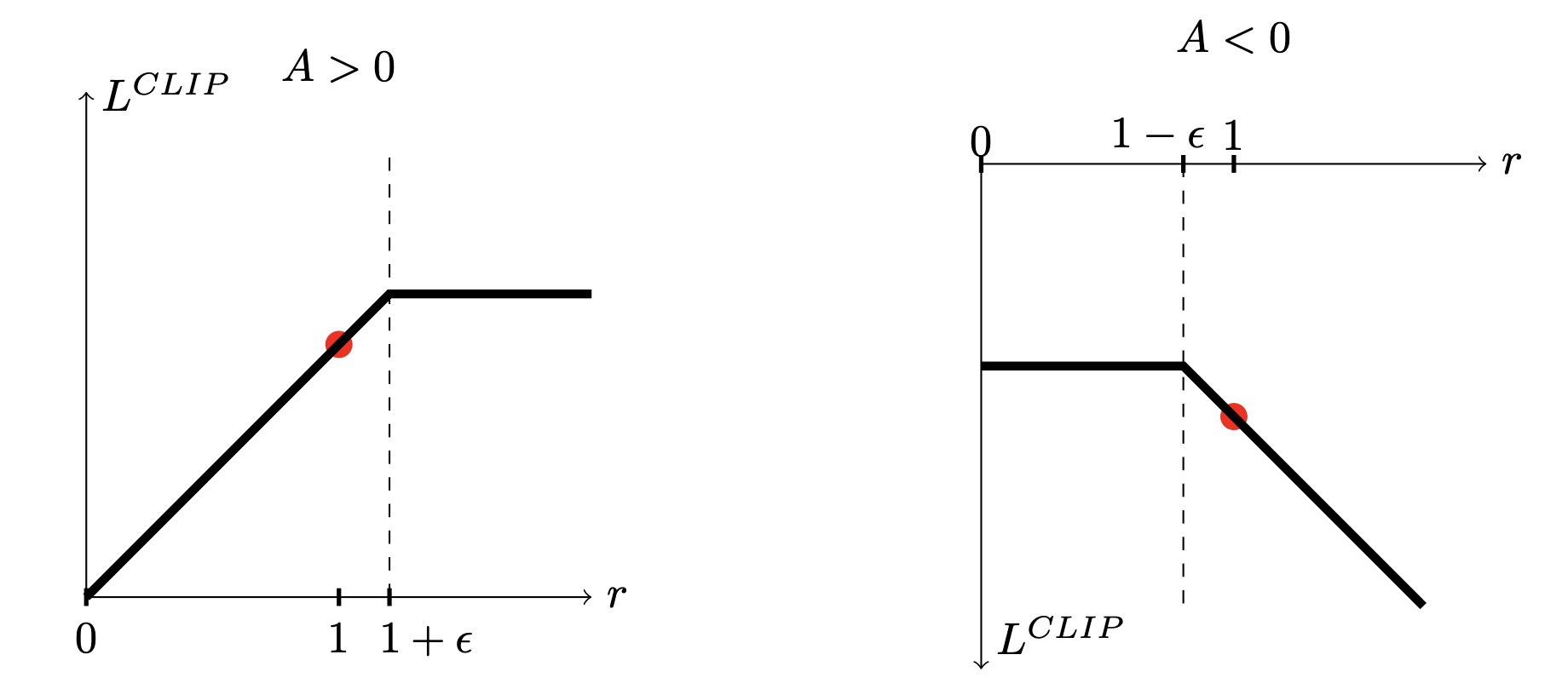 Because the advantage is positive, the objective will increase if the action becomes more likely—that is, if \(\pi_{\theta}(a|s)\) increases. But the min in this term puts a limit to how much the objective can increase. Once \(\pi_{\theta}(a|s) > (1+\epsilon) \pi_{\theta_k}(a|s)\), the min kicks in and this term hits a ceiling of \((1+\epsilon) A^{\pi_{\theta_k}}(s,a)\). Thus: the new policy does not benefit by going far away from the old policy.